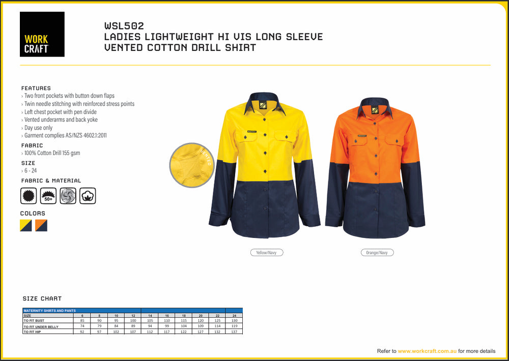 Workcraft Women’s Light Weight Hi Vis Vented Cotton Drill Shirt (WSL502)