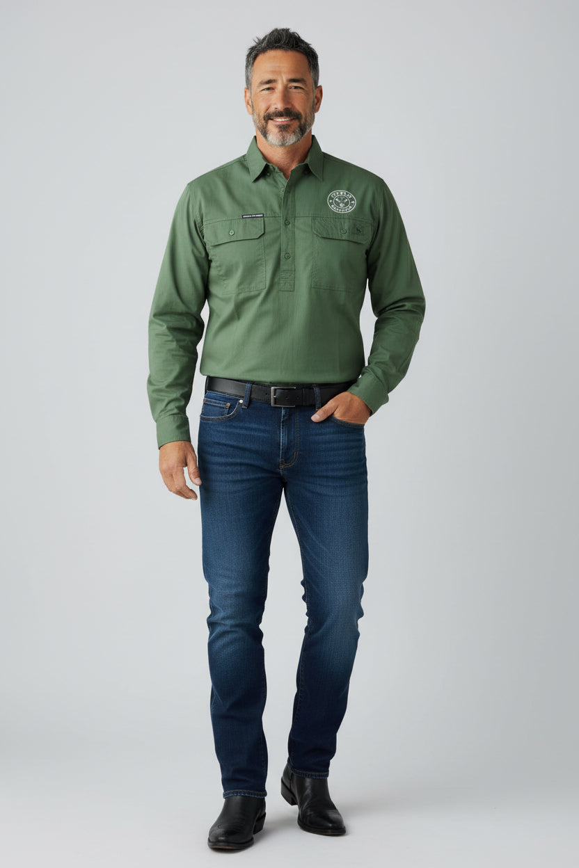 The Gibson is a classic half button long sleeve work shirt designed for Australian conditions and made to be worn hard. Manufactured by Outback Cobber and finished with the Outback Clothing Co logo embroidered on the chest, this is dependable workwear built for real use.